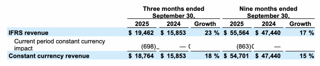 The company’s management and board of directors use constant currency revenue growth to evaluate growth and generate future operating plans. The exclusion of the impact of exchange rate fluctuations provides comparability across reporting periods and reflects the effects of customer acquisition efforts and land-and-expand strategy. Accordingly, it believes that this non-IFRS measure provides useful information to investors and others in understanding and evaluating revenue growth in the same manner as the management and board of directors. However, this non-IFRS measure has limitations, particularly as the exchange rate effects that are eliminated could constitute a significant element of its revenue and could significantly impact performance and prospects. Because of these limitations, you should consider this non-IFRS measure alongside other financial performance measures, including revenue and revenue growth presented in accordance with IFRS and other IFRS results.
