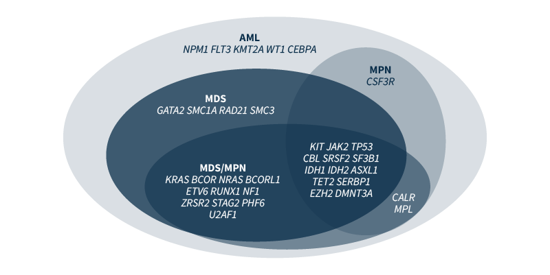 Myeloid malignancies or neoplasms are rare clonal disorders of hematopoietic stem or progenitor cells. They are caused by genetic and epigenetic changes that disrupt fundamental cellular processes, such as self-renewal, differentiation, and proliferation.1 Mutations encountered in myeloid malignancies include somatic variants, such as single nucleotide variants (SNVs), insertions and deletions (Indels), gene fusions, and copy number variations (CNVs). Some of the genetic changes are strongly associated with a specific phenotype (e.g., BCR/ABL fusion in chronic myeloid leukemia), but most are not linked to a single diagnostic entity (Figure 1).2