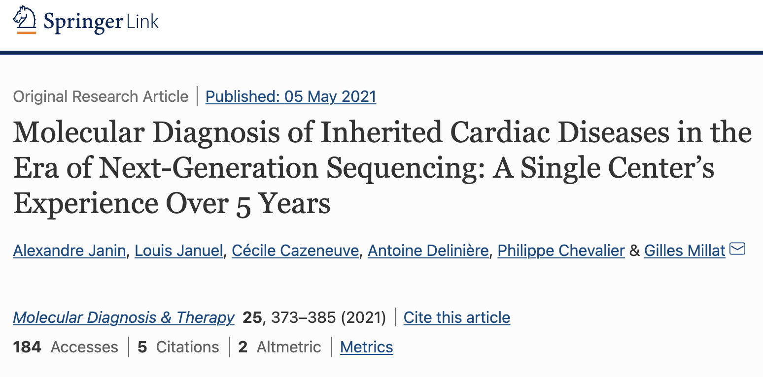 Janin A, Januel L, Cazeneuve C, Delinière A, Chevalier P, Millat G. Molecular Diagnosis of Inherited Cardiac Diseases in the Era of Next-Generation Sequencing: A Single Center's Experience Over 5 Years. Mol Diagn Ther. 2021 May;25(3):373-385.