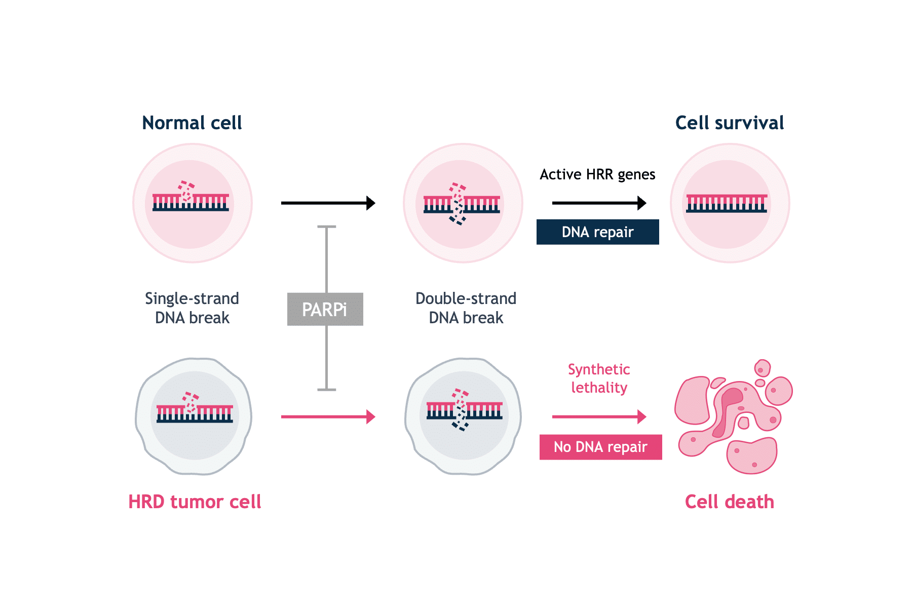 Cells respond to DNA damage by initiating multiple interconnected DNA repair pathways. HRR represents a central high-fidelity DNA damage repair system of DNA double-strand breaks. Functional defects in HRR are called HRD.1 The most known causes of HRD are loss of function mutations in genes involved in HRR including BRCA1, BRCA2, RAD51C, RAD51D, PALB2, as well as promoter hypermethylation of BRCA1.2 Over time, unrepaired or inaccurately repaired double-strand breaks lead to the accumulation of genomic aberrations, such as insertions and deletions, copy number alterations, or structural chromosomal rearrangements. These manifest as genomic instability, which drives carcinogenesis and disease progression.1