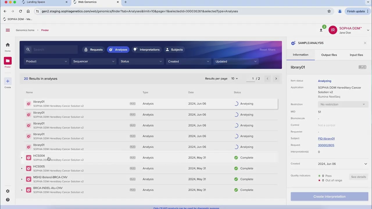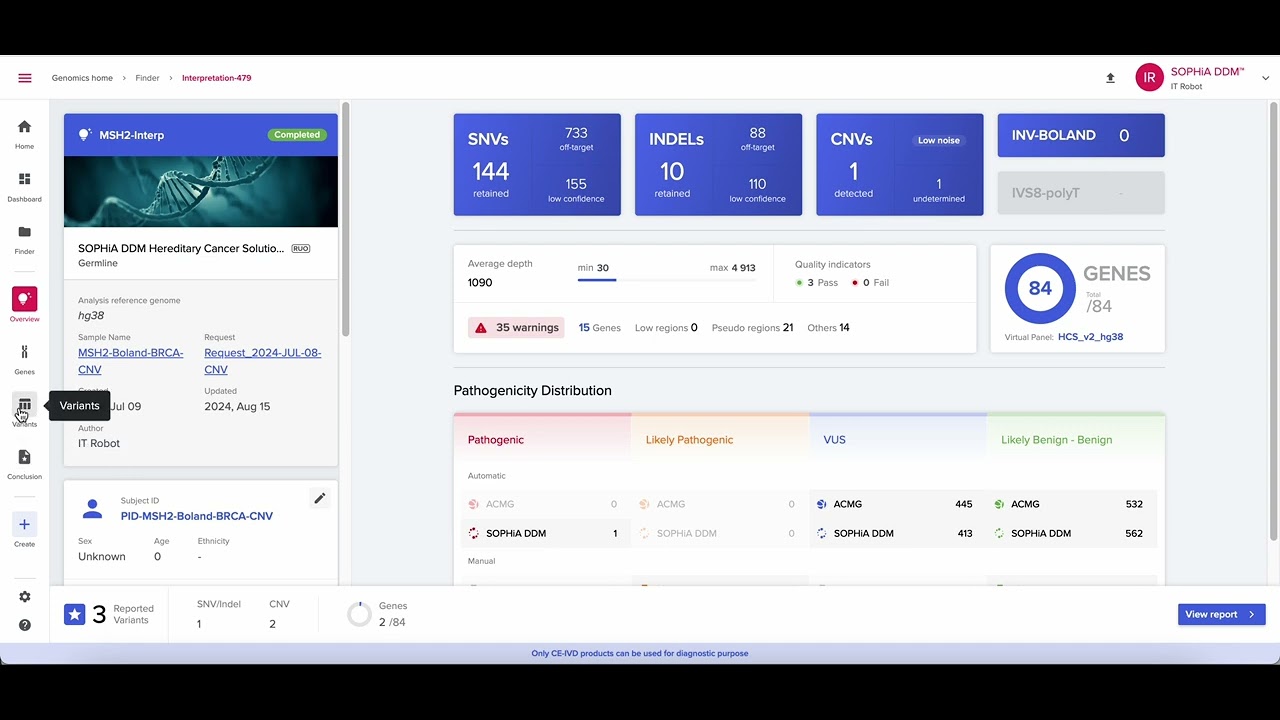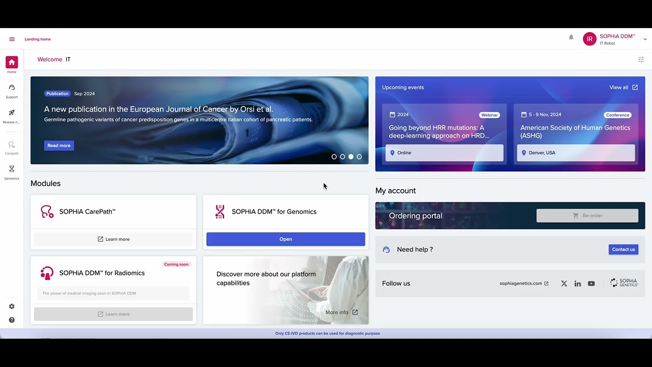SOPHiA DDM™ Dx Hereditary Cancer Solution, SOPHiA DDM™ Dx RNAtarget Oncology Solution and SOPHiA DDM™ Dx Homologous Recombination Deficiency Solution are available as CE-IVD products for In Vitro Diagnostic Use in the European Economic Area (EEA), the United Kingdom and Switzerland. SOPHiA DDM™ Dx Myeloid Solution and SOPHiA DDM™ Dx Solid Tumor Solution are available as CE-IVD products for In Vitro Diagnostic Use in the EEA, the United Kingdom, Switzerland, and Israel. Information about products that may or may not be available in different countries and if applicable, may or may not have received approval or market clearance by a governmental regulatory body for different indications for use. Please contact us to obtain the appropriate product information for your country of residence.